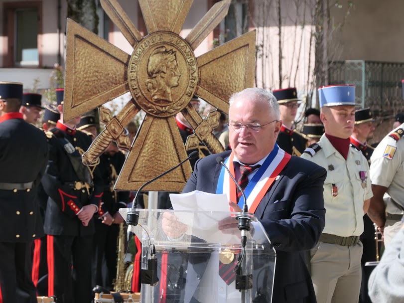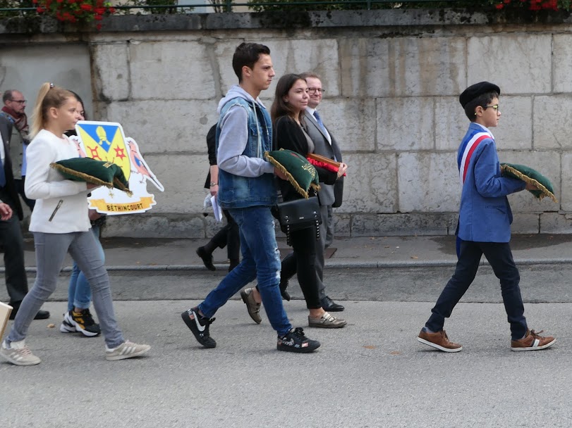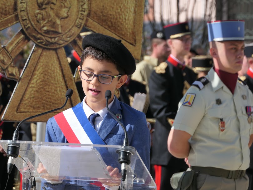 M. le maire d’Oyonnax avait lors de l’assemblée générale insisté sur le fait qu’il faisait un énorme effort pour intégrer la population oyonnaxienne et la jeunesse lors des commémorations. En effet, la population était nombreuse parc Nicod et c’est un enfant (maire du conseil municipal junior) d’une école primaire, âgé d’environ dix ans, qui a prononcé le premier discours; simple dans son vocabulaire, il fut remarquablement rendu par la qualité de la diction de ce très jeune homme. Derrière lui, 18 enfants du conseil municipal junior (composé d’une grande diversité ethnique) portaient chacun le blason d’une commune médaillée. Bravo Oyonnax!