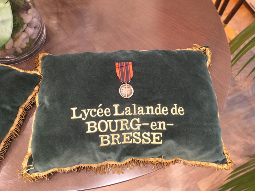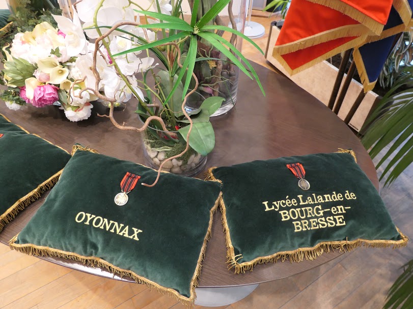 Bon accueil à partir de 9 heures dans la mairie d’Oyonnax: présents pour l’association: Denis Page et Sylvie Corazzini; le lycée était représenté par monsieur Schmitt, Dominique Béneton, deux porte-drapeaux garçons, une fille pour la médaille. Jean Bernard Lehnert nous a rejoints pour le défilé ainsi que Matys et Axelle, deux anciennes élèves, place Nicod.