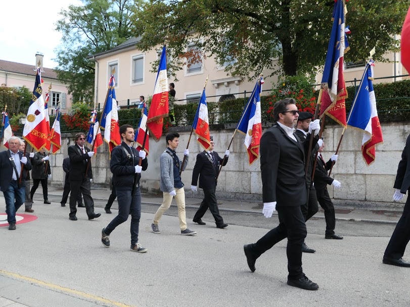 De la mairie au parc Nicod, l'association a suivi le cortège (musique militaire, détachement militaire, officiels dont M. le proviseur), le conseil municipal des enfants.